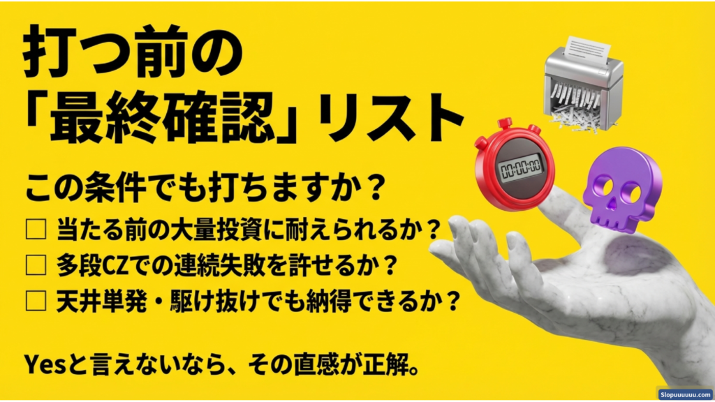 ここまでの内容を、打つ前のチェックリストとしてまとめます。読み終えた時点で、打ちたい衝動が残っているか確認してください。