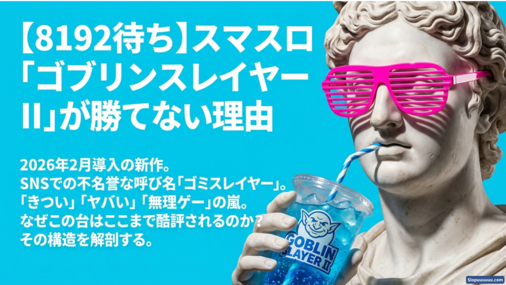 「スマスロ ゴブリンスレイヤーⅡ」(JFJ)は、2026年2月導入の新作スマスロです。導入直後からSNSや掲示板で「勝てない」「きつい」「ヤバい台」といった声が増え、評価も低めに傾きやすい空気があります。中には「ゴミスレ(ゴブリンスレイヤー→ゴミスレイヤー)」など不名誉な呼ばれ方まで出るほどで、導入直後の体感としてはかなり荒れています。