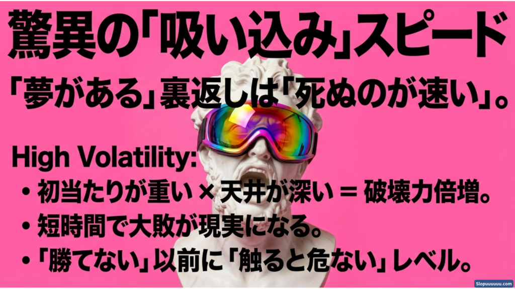 荒い台は勝つ時もあります。しかし多数の人に起こるのは負け側の体験です。だから「勝てない」より先に「触ると危ない」という空気が生まれやすくなります。