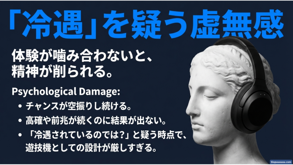 本機は一撃の夢があるように見えて、そのルートに乗れる人が少なく、多数は「当たらない時間」「吸い込み」「単発ばかり」「駆け抜け」で削られやすい構造です。しかも過程がきつい。だから評価が荒れ、冷遇という言葉まで出やすくなります。