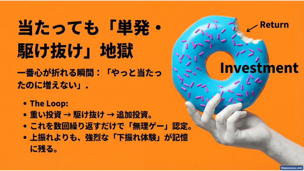 - 初当たりが重く、当てる前に投資が先行しやすい